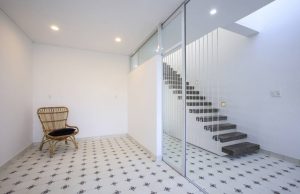 Hiên trước nhà được tạo thành từ một lớp thép hộp cong lõm vào trong, vừa...