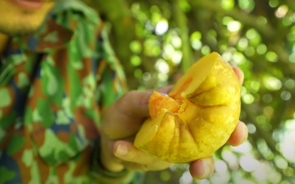 Khi còn non, quả có màu xanh mướt nhưng lúc chín lại chuyển màu vàng. Quả chín có thể ăn trực tiếp giống măng cụt nhưng chỉ nên thưởng thức phần thịt, không ăn hạt vì dễ bị say.
